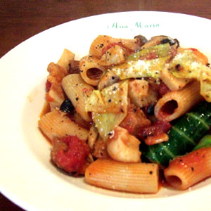 名前忘れたけれど、マカロニを大きくしたようなパスタが凄い美味しかったです。触感はペンネのような、もっちりとした歯ごたえ。(写真左)