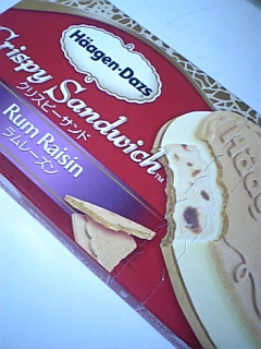 今日は仕事帰りにスーパーに買い物に寄り、例のハーゲンダッツのクリスピーサンド、ラムレーズン版を購入。